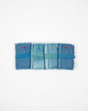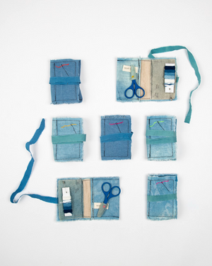 The book measures 2.75 x 3.75" and is secured with a 13.5" strand plant-dyed hand torn cotton poplin ribbon. The interior is lined with off-white wool felt and there is a single plant-dyed wool felt 'page.' Due to the nature of the indigo and scabiosa with which the fabrics have been dyed with, no two sewing kits will be the same!